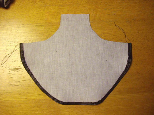 | 折り返して、10mmの縁取りで表から縫製します。一枚目は、折り返し部の口部分を裁ちかがり縫いで強化したのですが、今回はレザー自体が厚いので、必要ないと判断しました。 |